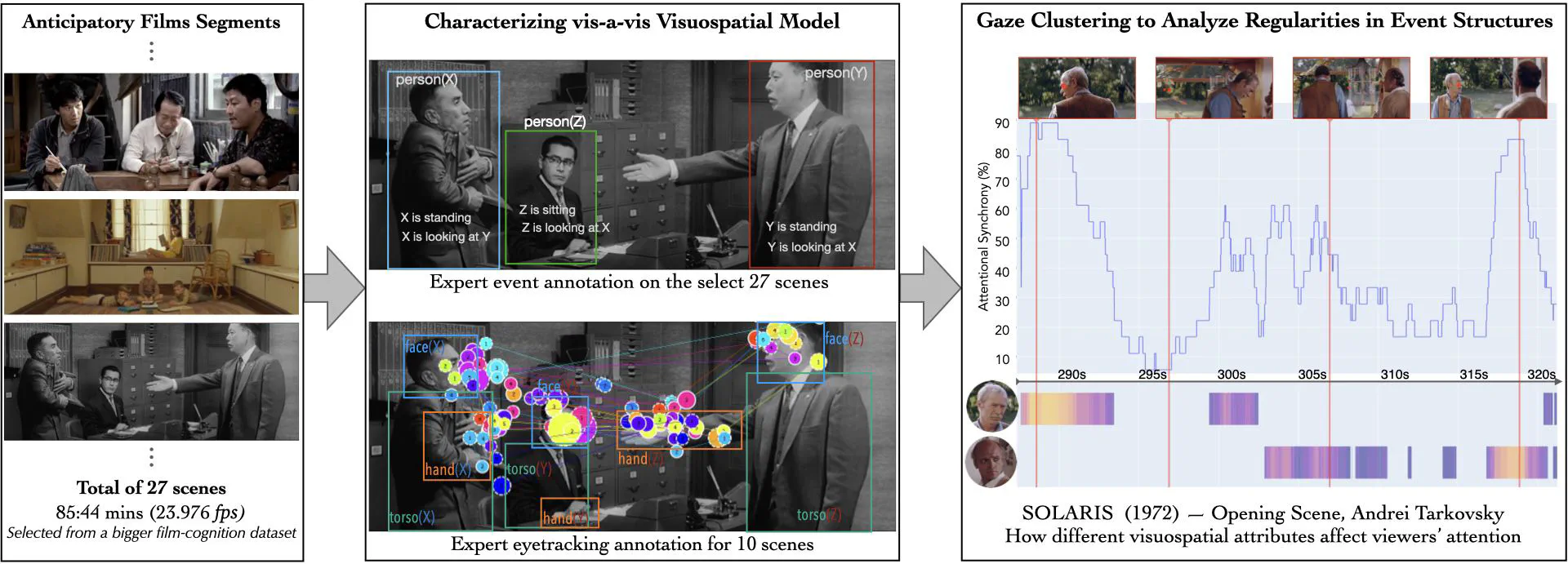 The talk emphasizes the importance of visuospatial attributes in everyday human activities and how they influence event segmentation, prediction and retrieval. Attending to these visuospatial attributes is the first step toward event understanding, and therefore correlating attentional measures to such attributes would help to further our understanding of event comprehension. Particular focus was on attentional synchrony amongst other attentional measures and analyze select film scenes through the lens of a visuospatial event model. Addtionally Here we present the results of an in-depth multimodal (such as head-turn, hand-action etc.) visuospatial analysis of movie scenes correlated with visual attention (eye-tracking 32 participants per scene). With the results, we tease apart event segments of high and low attentional synchrony and describe the distribution of attention in relation to the visuospatial features. This talk provided different means of using attentional measure for a scene with a particular visuospatial complexity, ultimately directing the attentional selection of the observers in a given context.