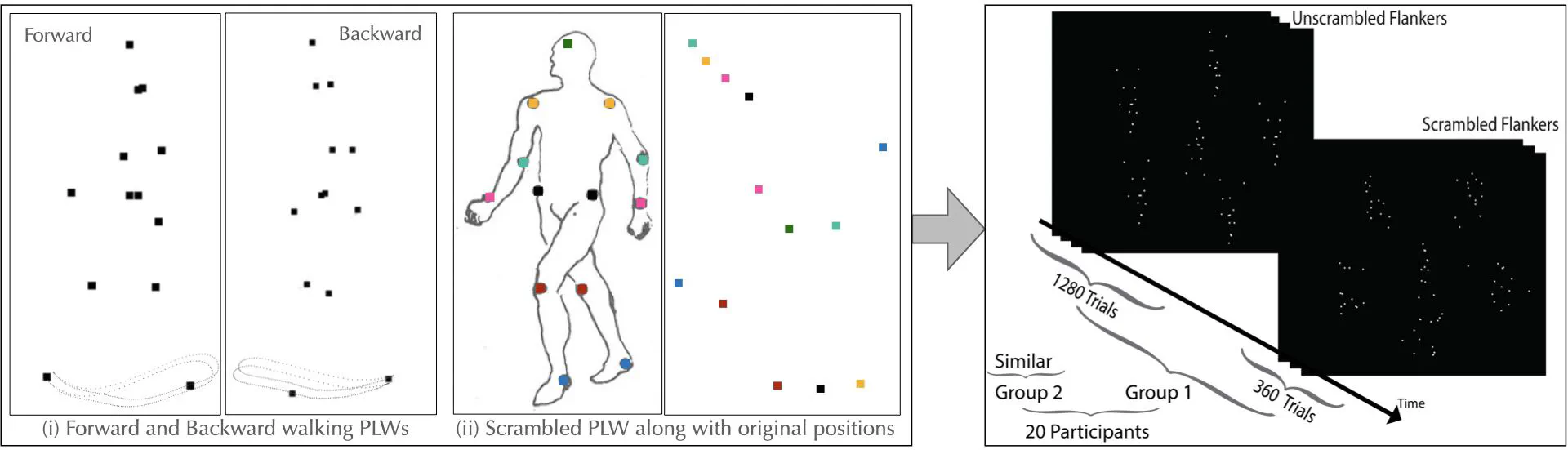 Previous studies on biological motion perception indicate that the processing of biological motion is fast and automatic. A segment of these studies has shown that task irrelevant and to-be-ignored biological figures are incidentally processed since they interfere with the main task. However more evidence is needed to understand the role of local-motion and global-form processing mechanisms in incidentally processed biological figures. This study investigates the effects of local-motion and global-form features on incidental processing. Point light walkers (PLW) were used in a flanker paradigm in a direction discrimination task to assess the influence of the flankers. Our results show that upright oriented PLW flankers with global-form features have more influence on visual processing of the central PLW than inverted or scrambled PLW flankers with only local-motion features.